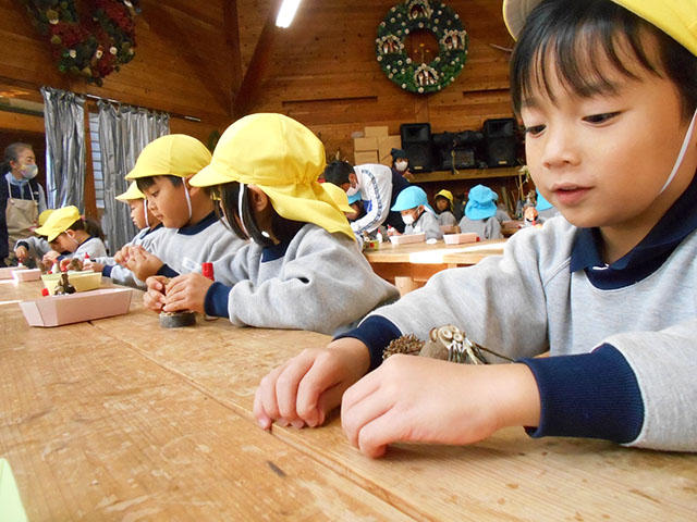 森の工作館では、久保先生やスタッフの方々が、木の実などの自然物で工作をしました。