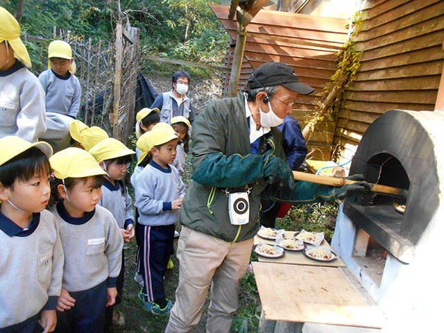 するとどこからか香ばしい匂いがしてきます。裏に回ってみると久保先生お手製のピザ釜の薪が燃えています。朝から手作りして下さったピザを釜へ・・ひとつひとつ丁寧に焼いて下さるのを見せてもらいました。
