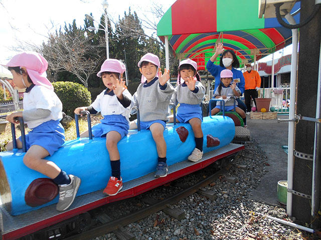 遠足は、初めての体験でしたが年少児は、にこにこ笑顔で、SL列車とアニマルティーカップとスゥィンギングベアーに乗りました。