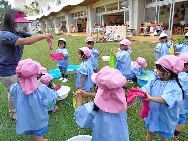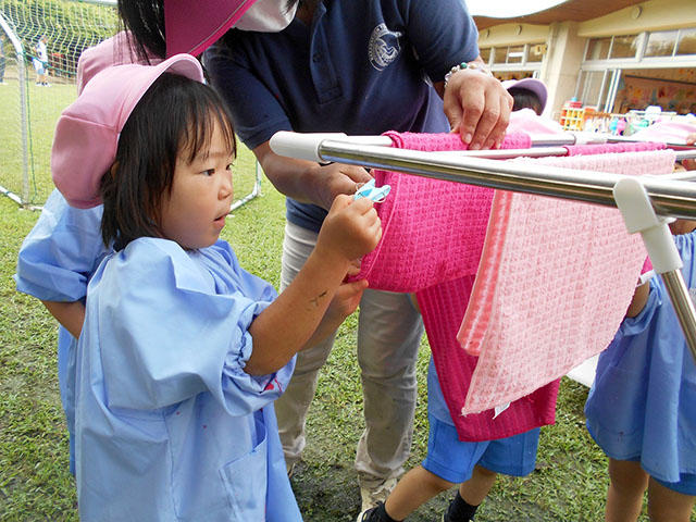 三歳児さんでも、丁寧に関わって楽しくお手伝いごっこをすると初めての経験にワクワク・どきどき嬉しそうです。気持ちいいのでずっと遊んでいたかったようです。水ですすいで・絞って・干すところまでやってみると、これも初めての経験でしたが、一生懸命に絞っている姿や洗濯ばさみでとめているいる姿がとっても可愛かったです。