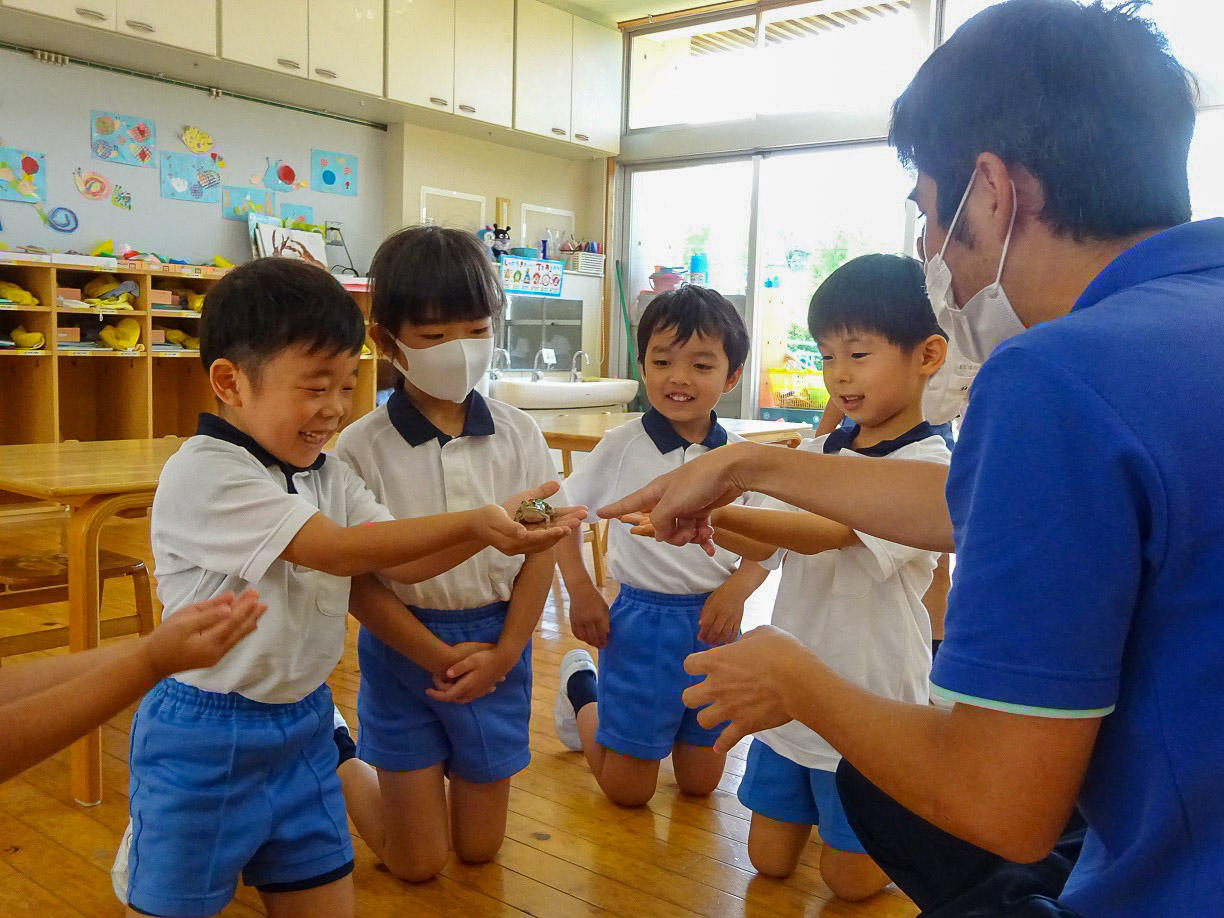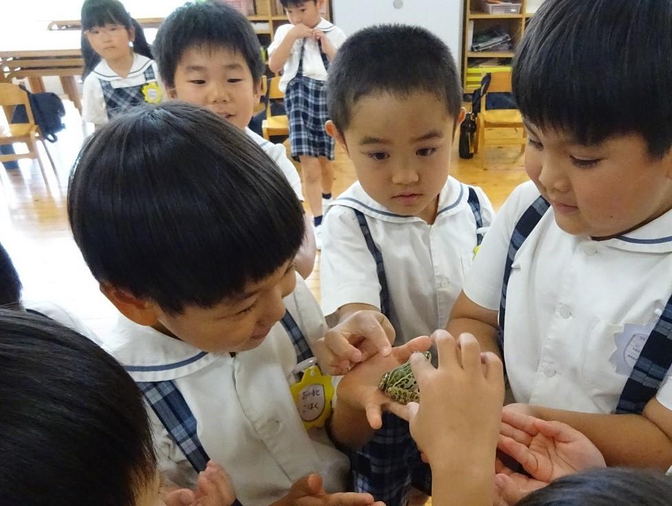 子供たちにカエルの気持ちを考えてもらいました。「きっとおなか空いてると思う」「広いところでぴょんぴょん跳びたいかもしれない」「おかあさんやおとうさんに会いたいかもしれない」などいろいろな意見がありました。