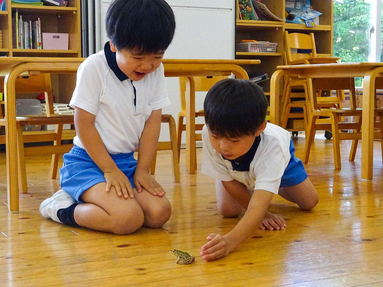 年長組では、たくさんの小動物が飼われています。「いもり」「やもり」「へび」「かえる」「おたまじゃくし」「ばった」「あげはちょうの幼虫」「かぶとむし」「くわがたむし」「かたつむり」などいろいろいますが、エサには何をあげたらいいのか図鑑などで調べています。