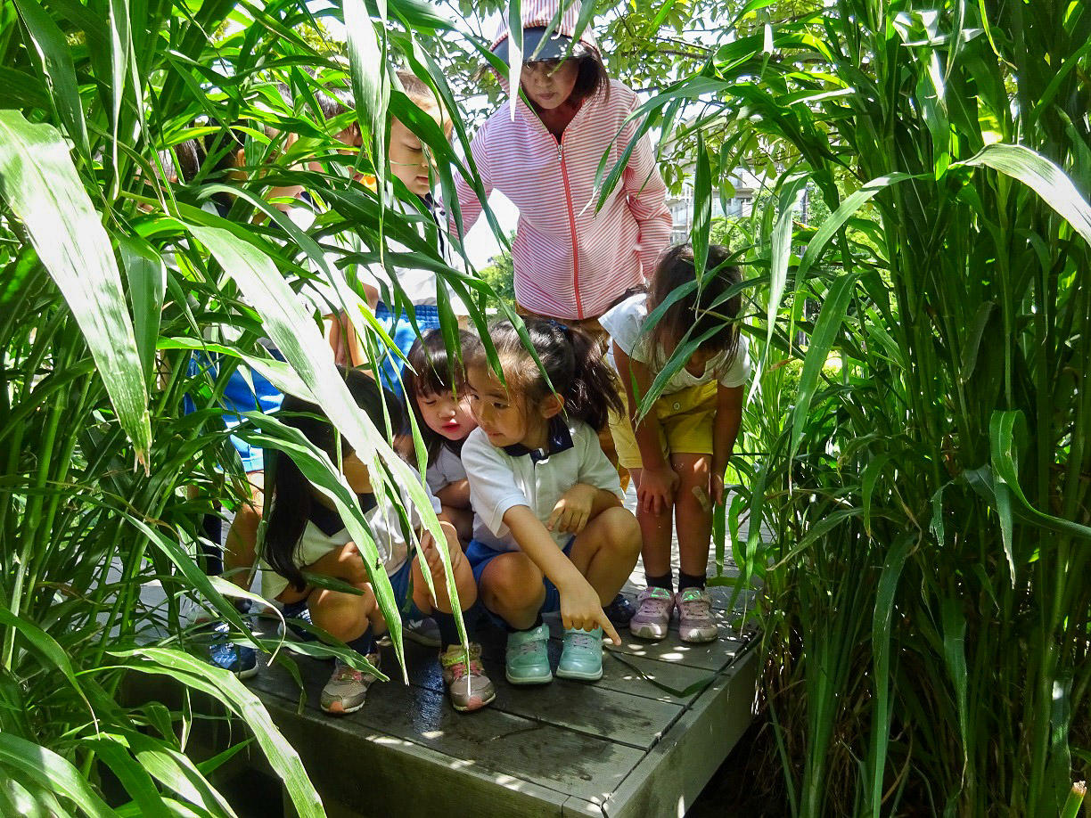 カエルたちは、元気よくビオトープへ飛びこんですいすいと逃げていきました。「かえるさんばいばい」「元気でねえ」「仲良く暮らすんだよー」と見送りました。