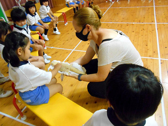 トカゲはおもちゃでは無くて生き物なので、触る前と後はしっかり手洗いをして、優しく背中を触ることを先に教えてもらいました。