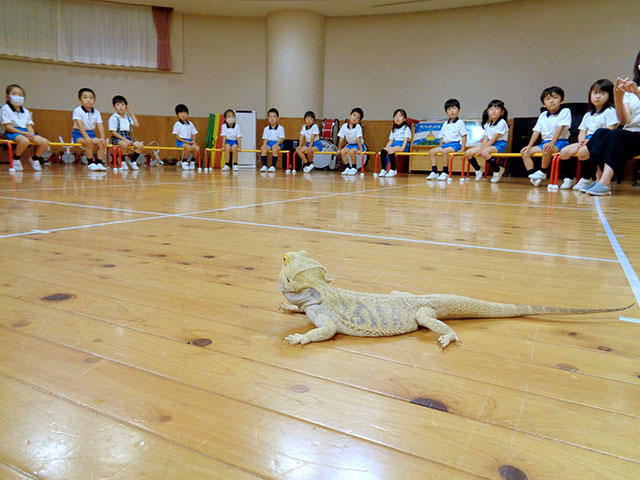 年長組には、沢山の小動物がおうちから届けられみんなで観察しています。そんな折におうちで飼っているのでよろしかったら見せてあげて下さいと『フトアゴヒゲトカゲ』を持ってきていただきました。