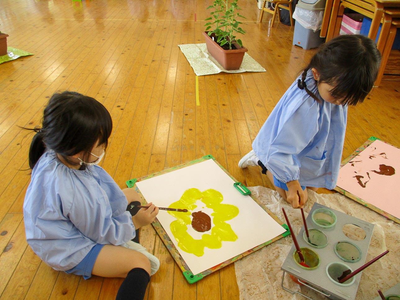 子供たちの目の前に「ひまわりの花」があって、しっかり見ることができたので、さっそく絵具で描いてみました。子供たちは、楽しそうにどんどん描き進めていきました。「お絵かきするのってたのしい!」という感じに見えました。