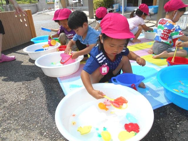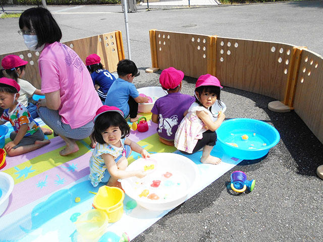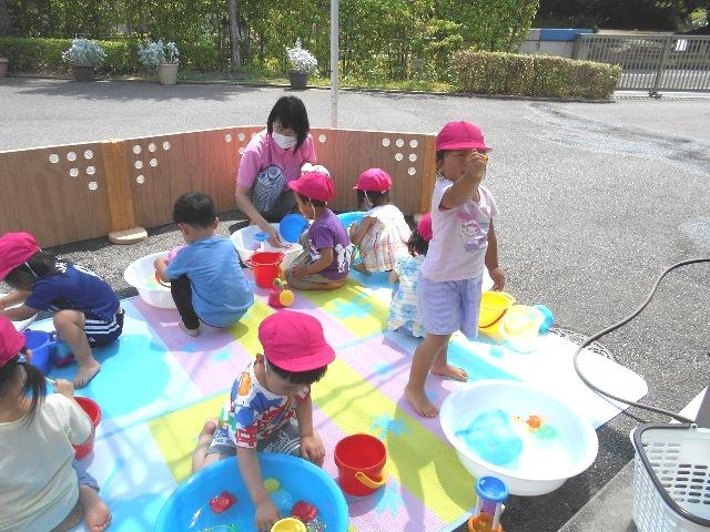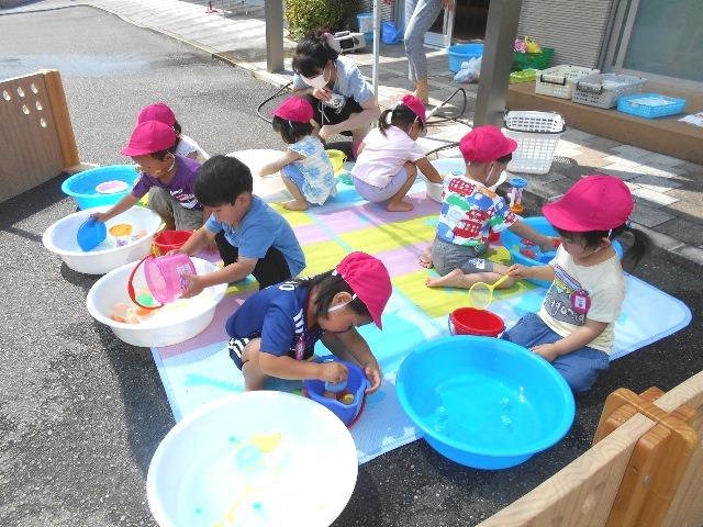 暑くなっているので、お水遊びを一人一人のたらいを用意して無心に遊んでいました。