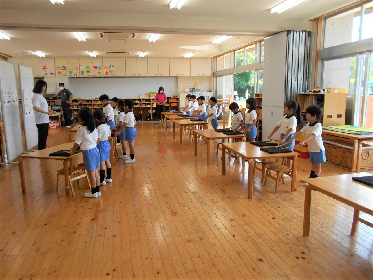 その後、年長児はマーチングの基礎練習に真剣に取り組んでいました。何の楽器を担当するのかについては各自一生懸命考えているようでした。