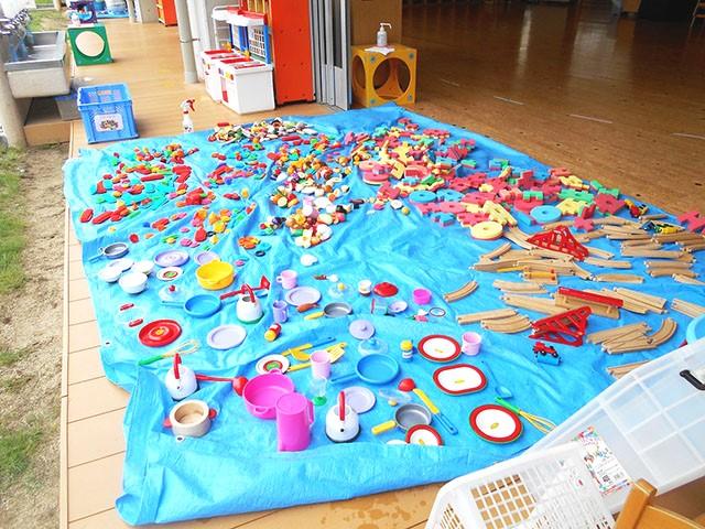 子供たちの帰った後は、毎日先生たちが保育室やおもちゃや机・椅子の消毒を行っています。