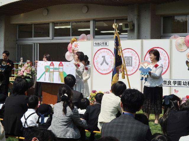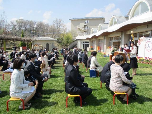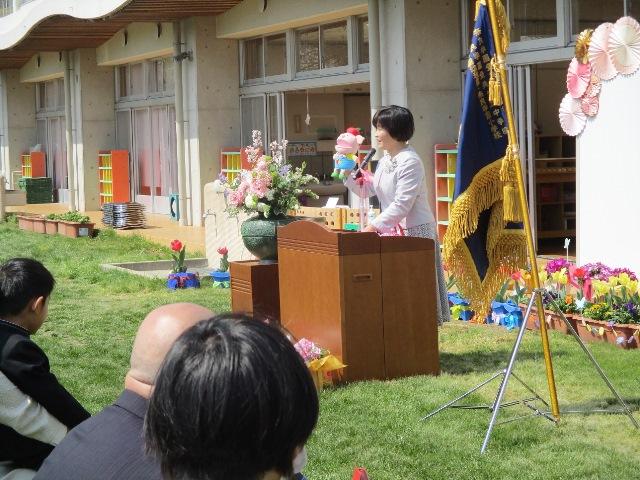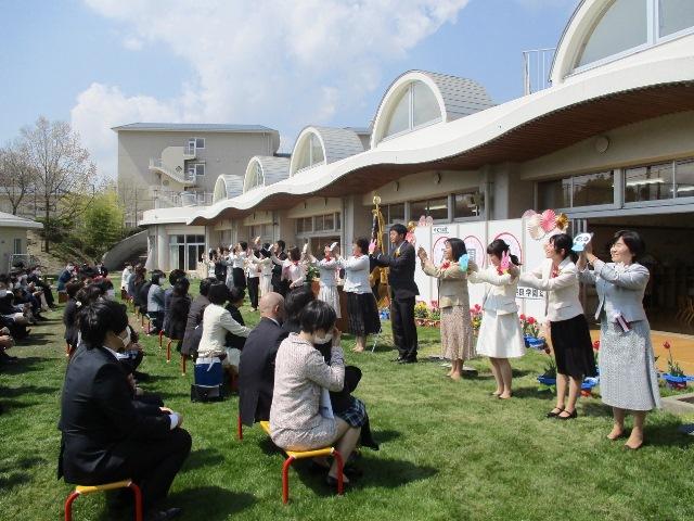 新型コロナウイルス感染症拡大防止では3つの密を避けることが望ましいということで、前日に急遽園庭で行うことを決定し、会場設営を行いました。初めてのことで職員の不安もありましたが、当日は見事に晴れ渡り心も晴れ晴れした気持ちになれましたので、新入園児にも保護者の皆様にも安心の笑顔を見せることが出来ました。
