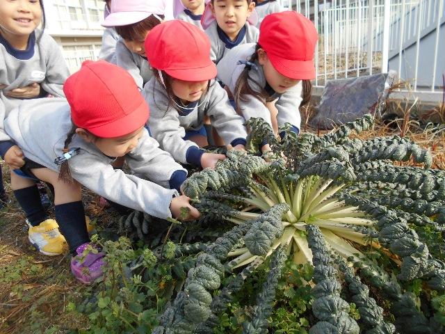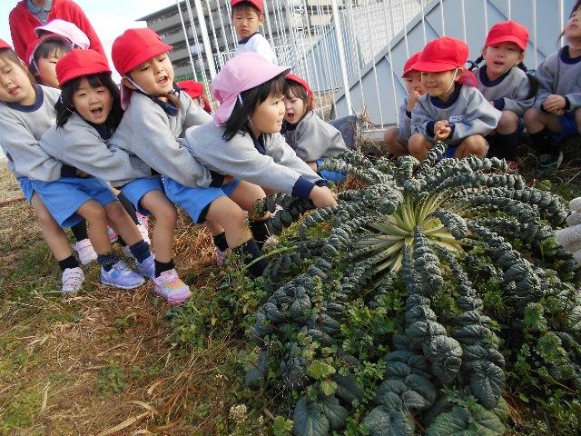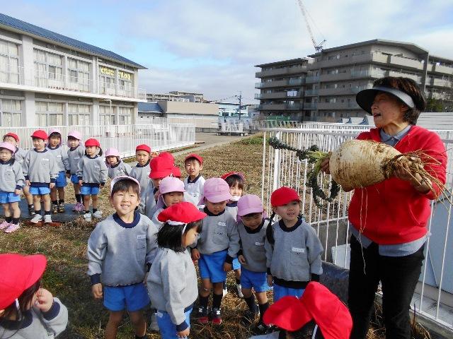 年少組は、尚志祭の劇遊びで、『大きなかぶ』を演じます。今、お話を聞いて劇の練習や歌の練習をしている最中です。そんな折、小学校の先生が「桜島大根が出来たので子どもたちに見せてあげて下さい」と言って下さいました。