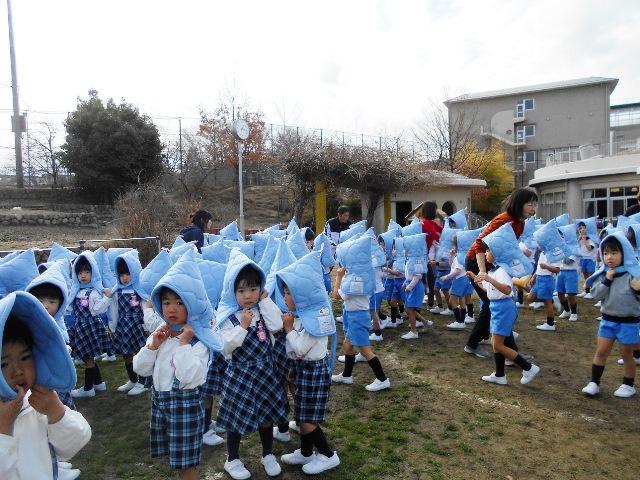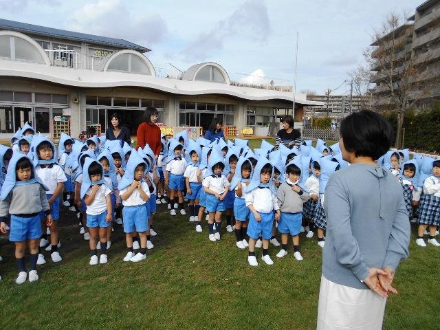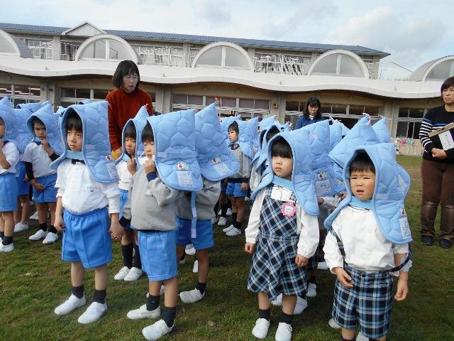子どもたちは、これまでの避難訓練の経験と担任からの震災の時の話を聞いた経験からか、比較的落ち着いて防災ずきんを被り避難することが出来ました。実際の地震の時の話も紙芝居や絵本で聞いて、不測の事態に対応出来るように学習しました。