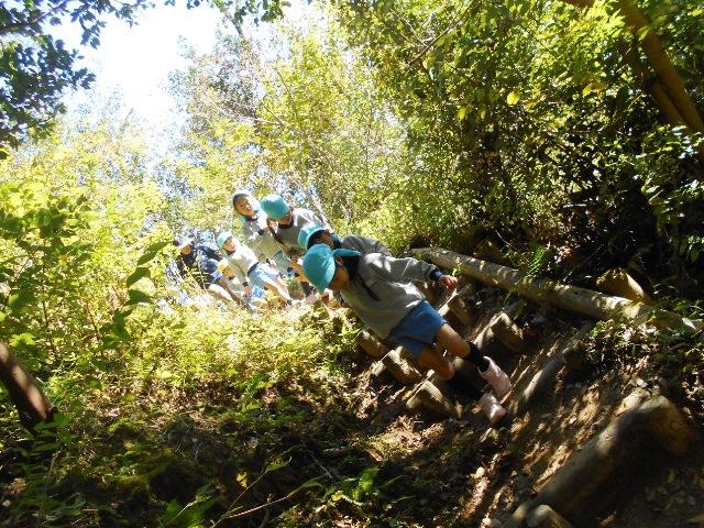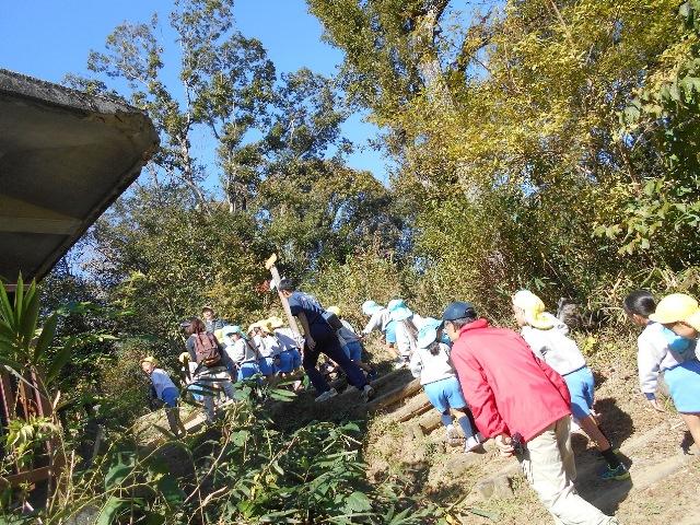 到着すると久保先生たちが出迎えて下さって、早速秋の森のお話と森の探検です。子どもたちは細いくねくね道や階段や坂道をわくわくしながら進みます。途中でまたまた、「いろはもみじ」「苦木」「臭木」「ふゆいちご」「のあざみ」いろいろな植物に出会います。いのししの掘ったあともたくさんみつけました。台風で倒れた木の根っこから芽吹いた苦木もありました。一度行ったことのある道ですが、まだまだ不思議がいっぱいです。歩きにくい道も軽々と歩いて行く元気な子どもたちです。「なんだか楽しいよねえ」とか「また、これて良かったねえ」と言う声があちこちで聞こえます。
