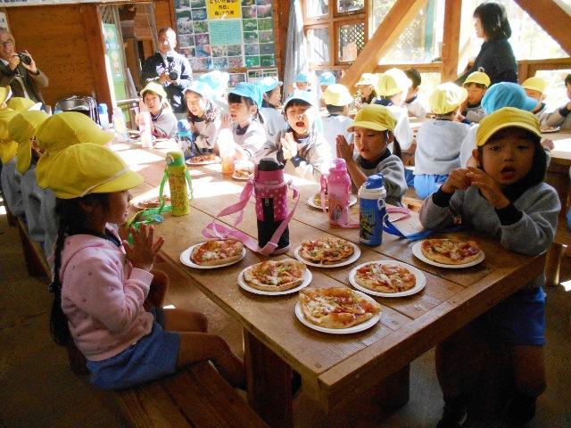 おなかがすいてきたところで、香ばしいにおいがします。生地から捏ねて自然食材を使ったピザが焼けたようです。久保先生の作られた石窯で一枚ずつ焼いて下さって焼きたてをいただきました。「こんなおいしいの生まれて初めて食べる」「ピーマンもトマトも美味しい」「生地はもちもち」と食レポが始まります。少しですがおかわりした子もいましたよ。