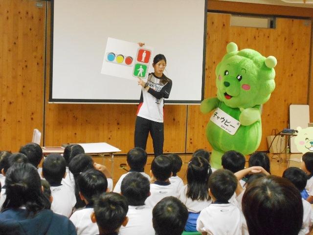 初めは全学年で交通ルールをわかりやすく映像やマスコットキャラクターなどを使って教えていただきました。