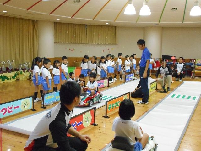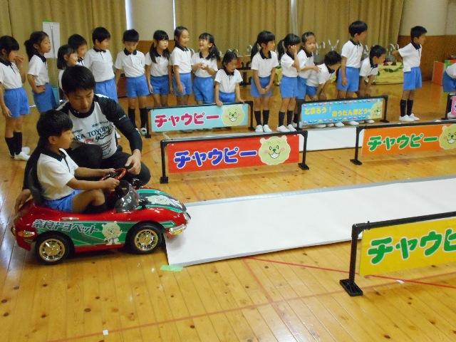 最後に、年長児は、「電気自動車」に乗って、横断歩道の前や赤の信号機では止まるというルールを守って一人ずつ上手に運転できました。横断歩道の前できっちり止まる運転はなかなか難しかったようですよ。