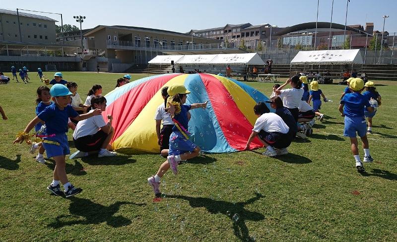 PP3(年長児)は、Y2生(高校1年)とパラバルーンの演技をしましたが、アリーナで一度合わせただけなのにとてもスムーズで良く出来ていました。