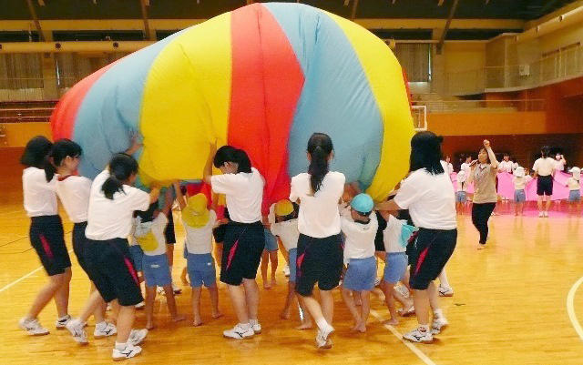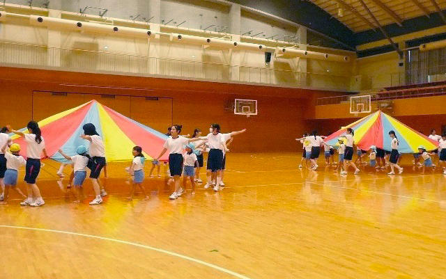 プログラムの中には高校生(Y2生)のお姉さんと年長児(PP3生)によるパラバルーンの演技があります。