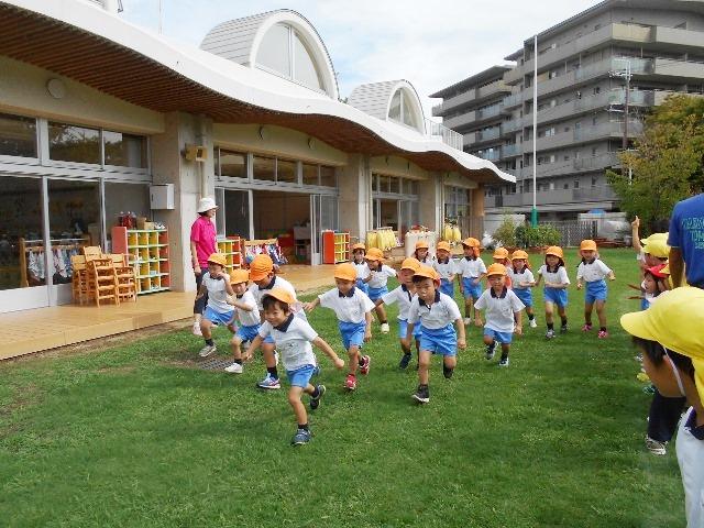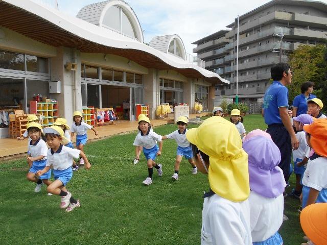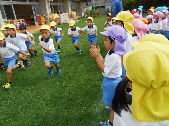 今週の「うきうきタイム」はかけっこがテーマです。初めはみんなで走って、芝生の園庭で「止まったときにポーズ」を決めていました。