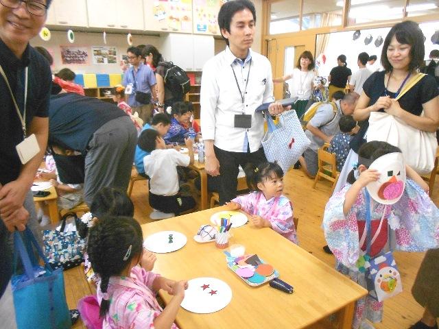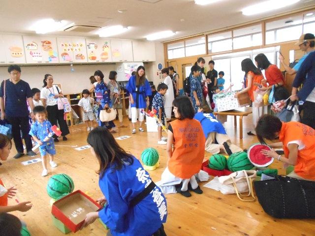 毎年、役員様方の凝った工夫いっぱいのお店にびっくりしますが、今年は「スイカ割り」と「初めてのおつかい」と「ヨーヨー釣り」と幼稚園の先生の「おめんやさん」と小学校の先生の「ストローヘリコプター」でした。