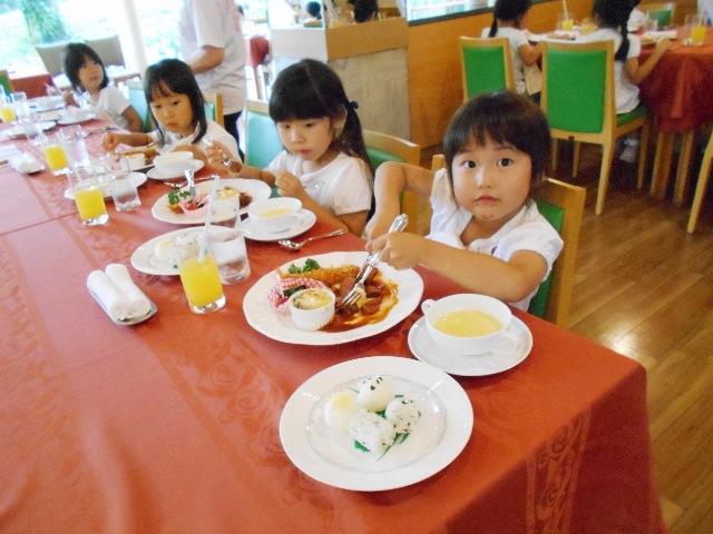 本格的にフォークとナイフを使って食事をするとみんな「ほっぺが落ちそう」と言いながらにこにこの笑顔で食べました。「こんなごちそうなかなか食べられないなあ」とか「たくさんで食べきれないかも」とか楽しい会話も聞かれました。