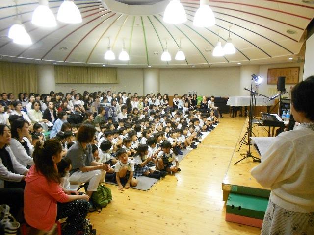 日本地図で佐賀県の場所を示すときは、ユーモアを交えて、子どもたちはぐっと引きつけられました。その後子どもたちのなじみのある「どんぐりころころ」「ちゅーりっぷ」「ちょうちょ」と続き、富士山の火口で全国から集まった人たちと夢を書いたハンカチで繋がった画像を見ると会場のみんなが、驚きました。「いただきます♪」「てをつなごう♪」は、子どもたちも以前から歌っていたので、弓削田さんの綺麗な声と一緒に歌いました。