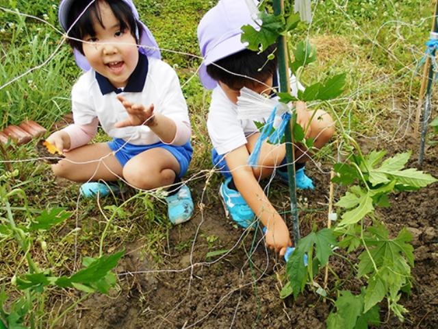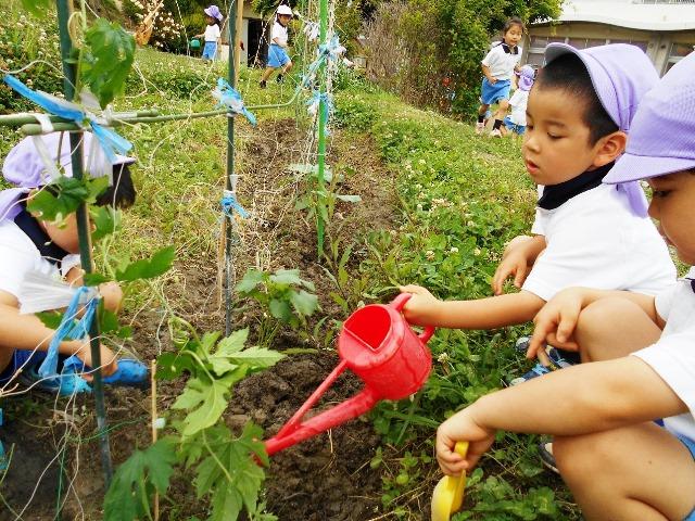 年長組が植えたエンドウ豆の収穫を一緒にした場所で、夏野菜を植える体験をしたので、また、収穫出来るのが想像できたのでしょうね。「私にも植えさせて」「僕にも植えさせて」と積極的に植えていましたよ。子どもたちの意欲は、こういうときに湧いてくるのですね。たくさん実るといいですね。毎日お世話をして、他の学年にもお裾分けが出来たらいいですね。自分の手で植えた野菜の収穫が、楽しみです。