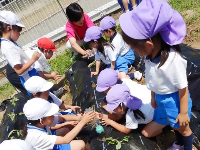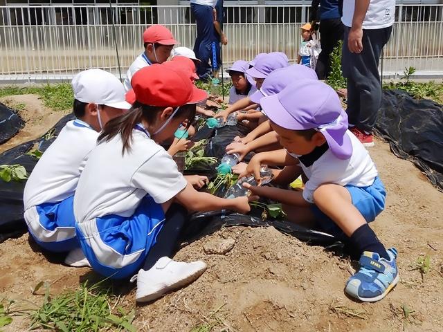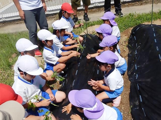 子どもたちは、初めサツマイモを植えると言って喜んで畑に向かうと「おいもじゃないのか」と苗を見ていました。