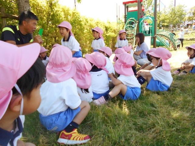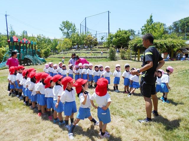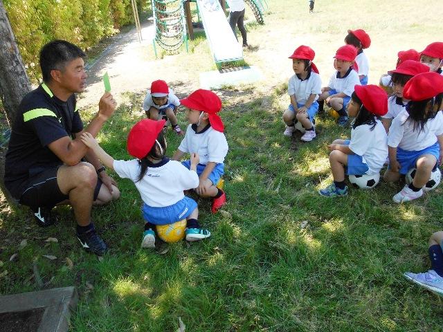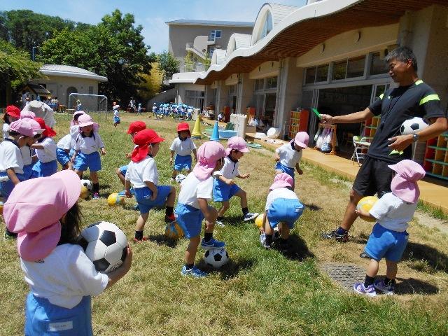 初めての「体育の先生とあそぼう」の時間です。年少組が中高の体育の先生にサッカーを教えてもらいました。