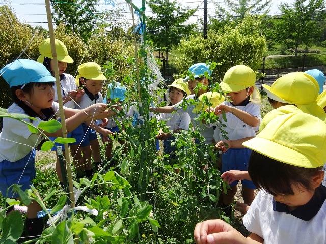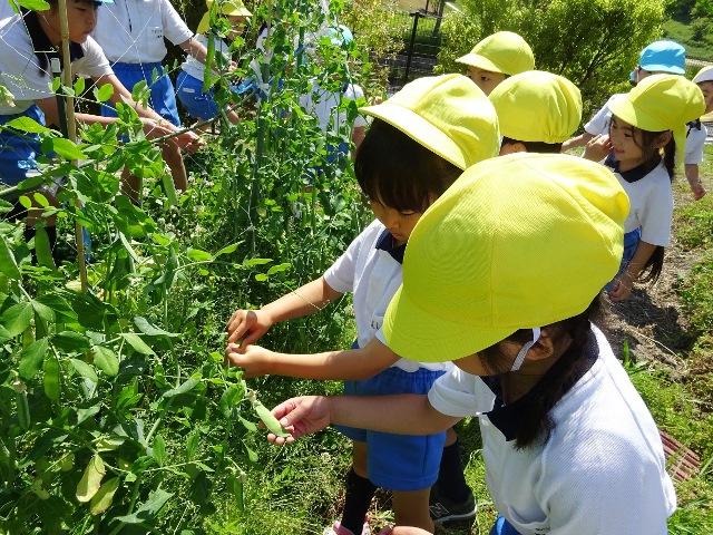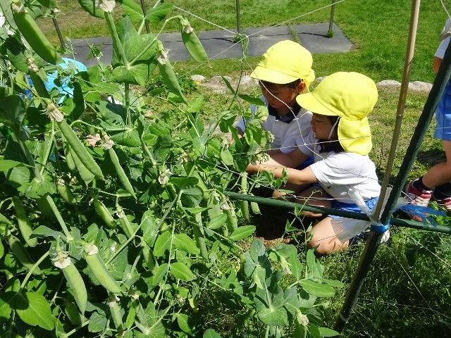 年長児が、年中の時に植えたエンドウ豆を収穫しました。