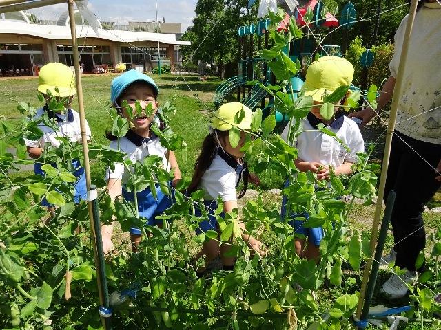 毎日豆が膨らみ、年長組は五鞘ずつ持ち帰ることが出来ました。まだまだ、豆が膨らんでいます。年中組も年少組も穫れるといいですね。