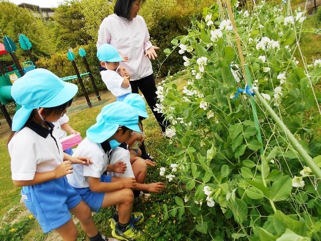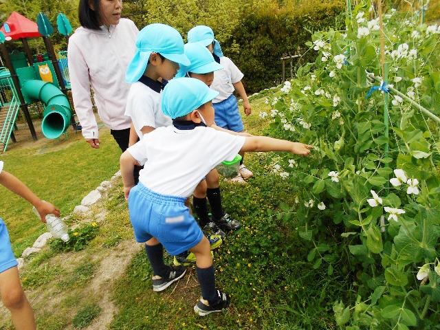 エンドウ豆が膨らんで豆がいっぱい出来たら、みんなで鞘を むいて食べることが出来たら嬉しいですね。