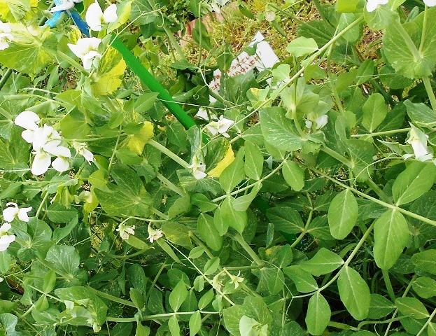年中の時に植えたエンドウ豆が、白い花をつけ、可愛い鞘をつけ始めています。