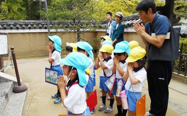 たくさんの手を持つ千手観音様を見て、びっくりしました。「いろいろなものを持っているねえ」「どうして、あんなにたくさん手があるんだろう」「大きいねえ」と言いながら、ゆっくりと見上げていました。「そうか、みんなのことを守ってくれて、助けてくれるためのお手々なんやねえ」