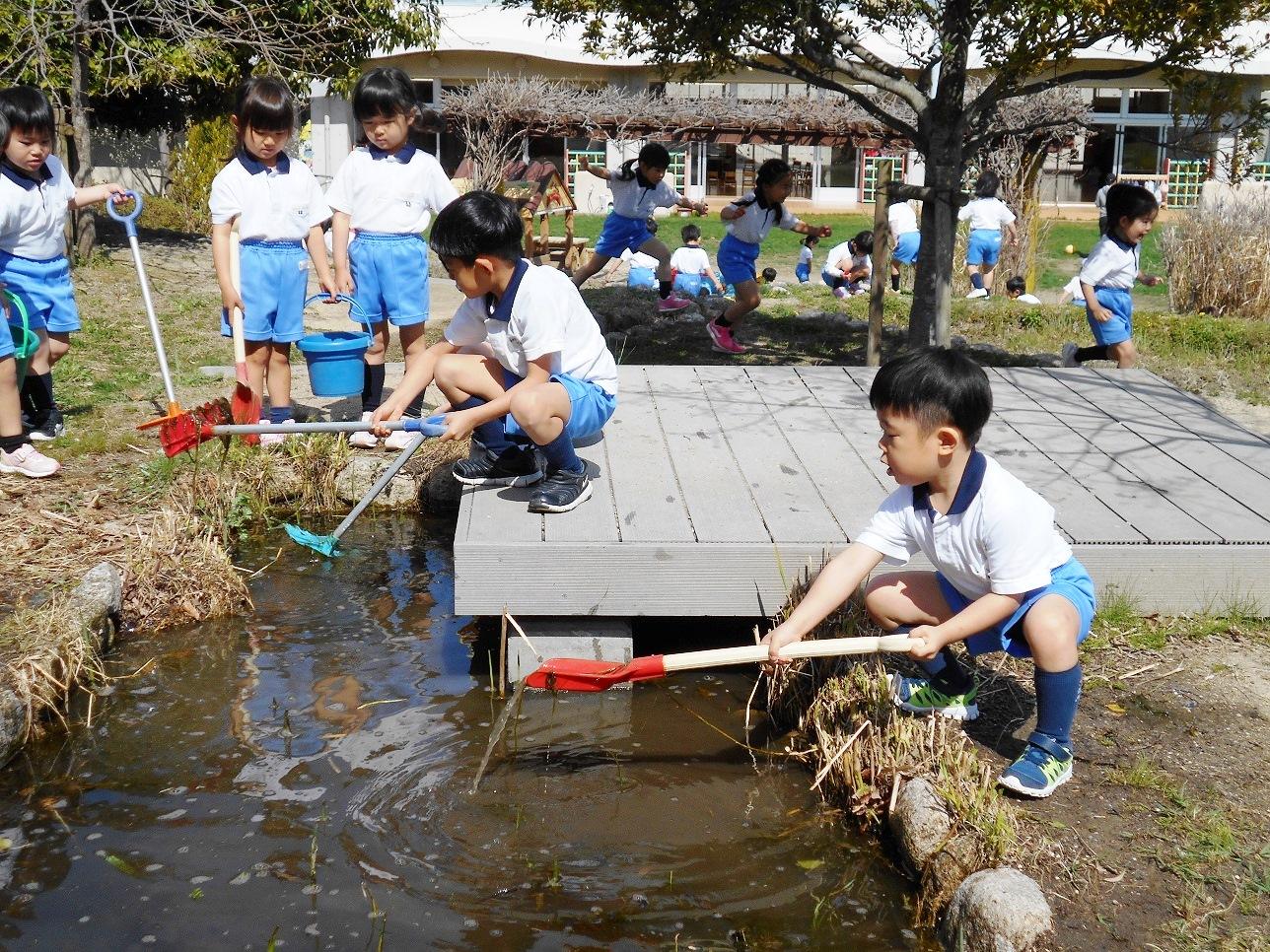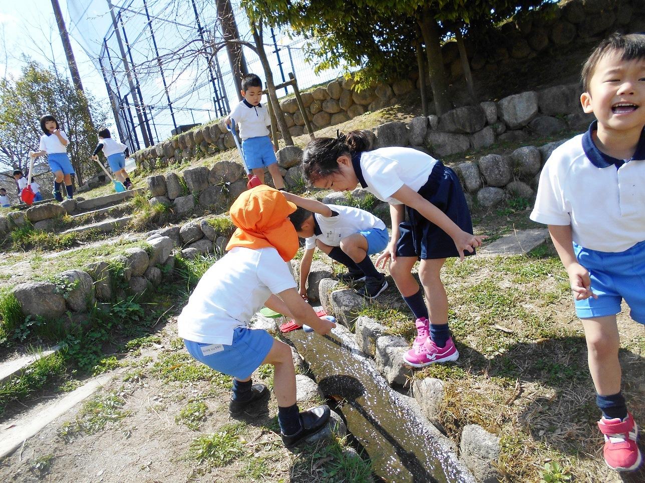「川が流れてる」「いっぱい貝がいた」「どこから流れてるんやろうか」「たんぽぽいっぱい咲いてたよ」「春やねえ」など可愛い声がいっぱい聞こえてきます。