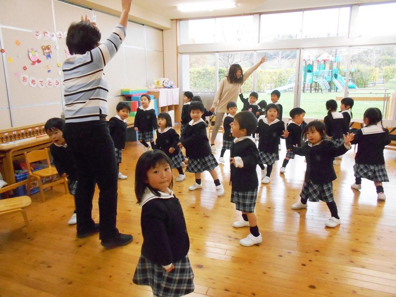 年長組では、年中組の時と違うクラスになったお友達ともいっしょに体操やリズムをしたので、のりのりで楽しい雰囲気になれました。