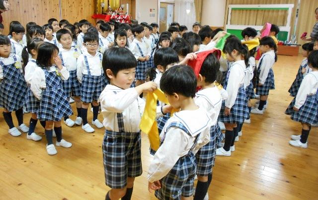 年長組は、少し照れくさいようなちょっとさみしいような感じで、年中組に襷をかけてあげていました。