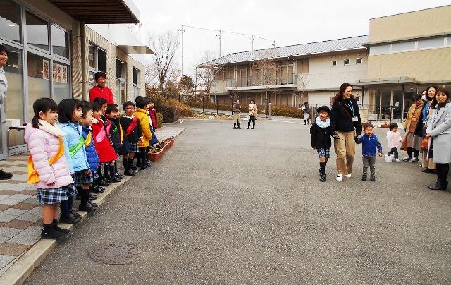 来年度、年長組から年中組に『挨拶当番の引継式』をしました。
