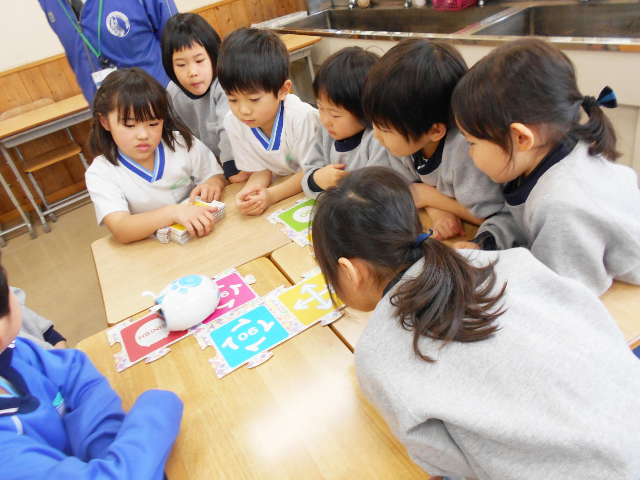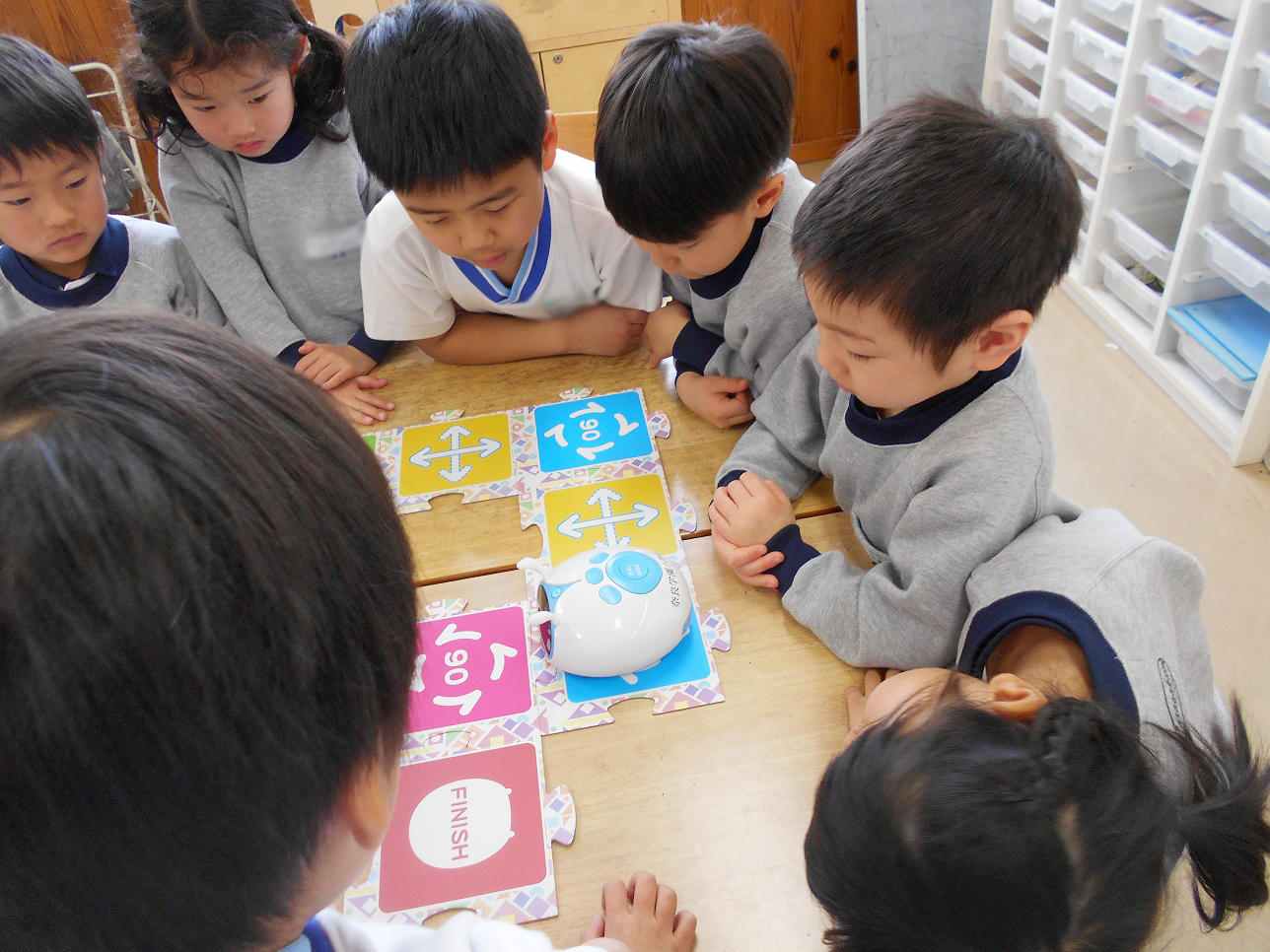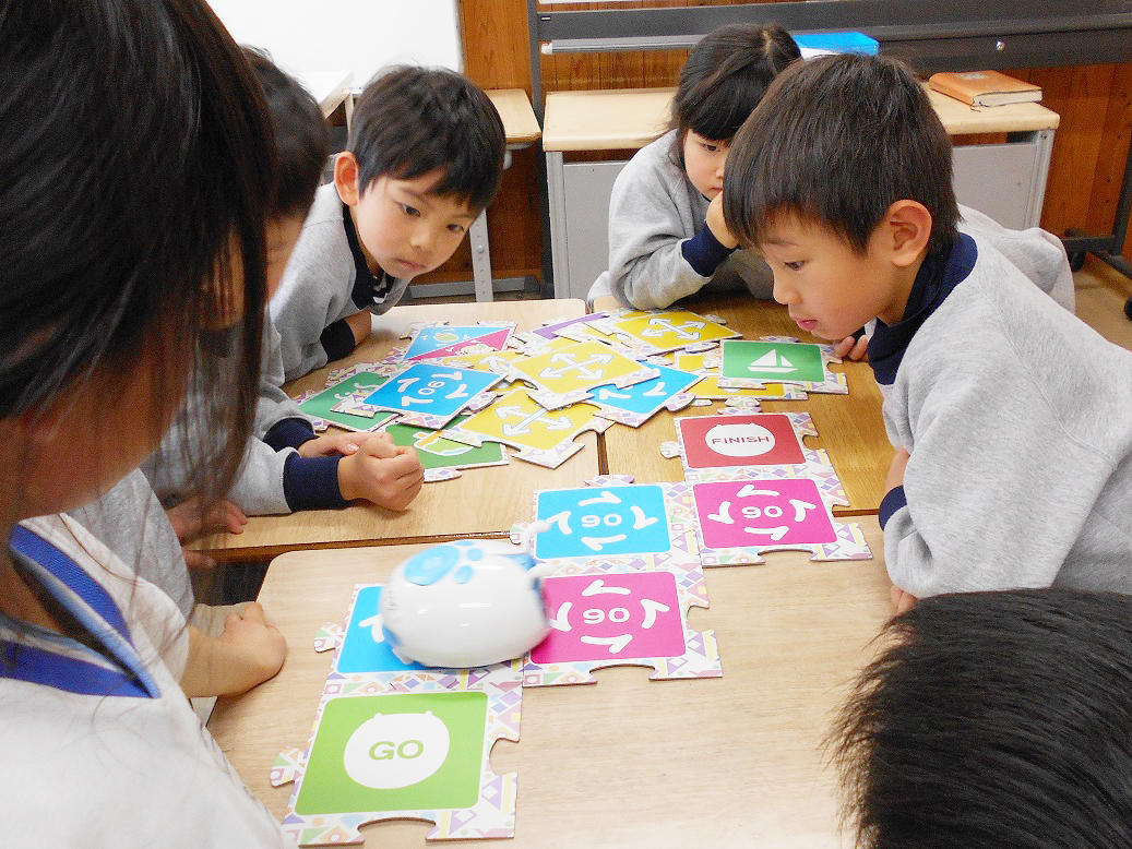 P1(小1)が、プログラミング用知育ロボット『アリロくん』を使ってプログラミングの基礎を学習していました。PP2(年中組)の子どもたちも参加させてもらいました。