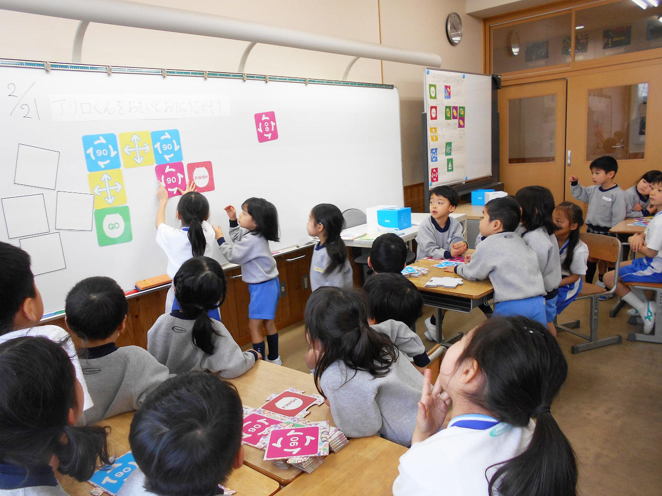 先生の出題された道のあきスペースに、どのカードを置いたら『アリロくん』がGoからFinishまで、移動出来るかみんなで考えます。プログラミンどおりに移動出来たら正解です。『アリロくん』が、うまくプログラミングした道を移動出来るか真剣に見ています。Finishまで、たどり着いた時には、グループみんなで「できた!」と大歓声があがります。