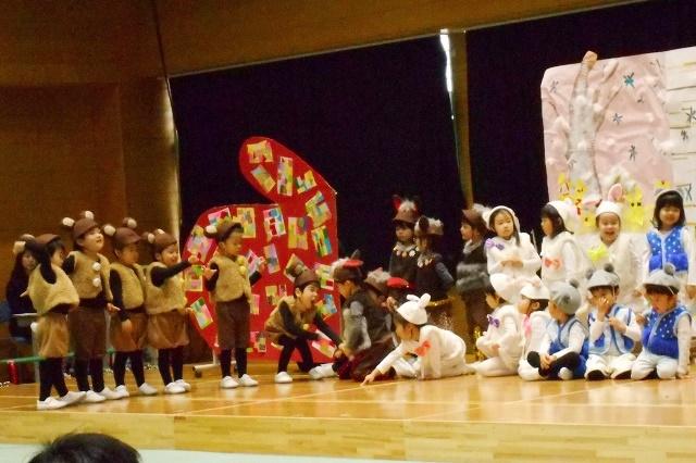 年少組は、「てぶくろ」年中組は「ブレーメンの音楽隊」年長組は「アラジン」の劇をそれぞれ身体いっぱい心いっぱい表現することが出来ました。応援ありがとうございました。