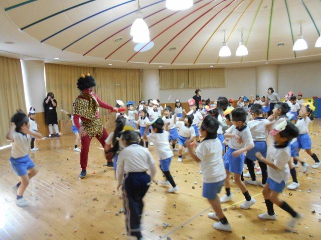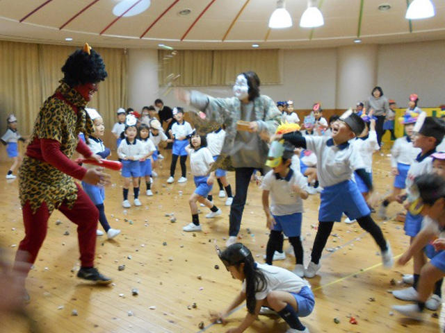 今年の赤鬼は、中高の体育の先生に美術の先生が、フェイスペイントをしっかりして下さったので、とても迫力のある姿でした。子どもたちは、一瞬びっくりして泣いてしまう子もいましたが、怖い鬼にも果敢に挑んでいきました。遊戯室中に「おにわ~そと!おにわ~そと」と言う元気な声が響き渡りました。逃げ回る子どもたちもいましたが、包装紙や新聞紙で、作った豆を一生懸命蒔く子どもたちがいっぱいいて、大変賑やかな豆まきです。