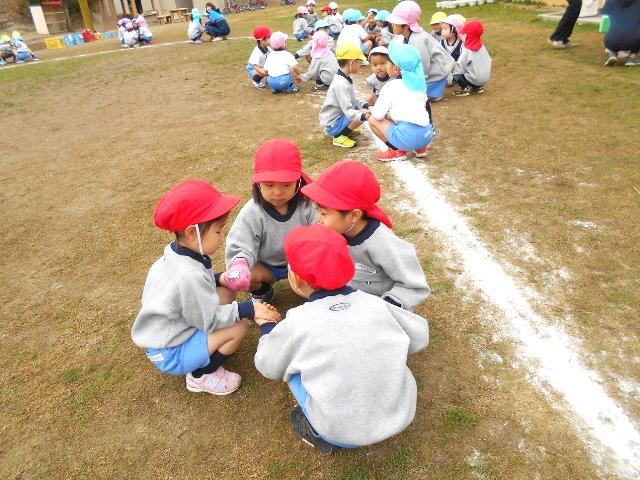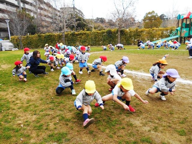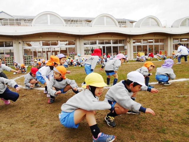 木曜日は、うきうきタイムの時間に全員で、体育遊びをします。今日は、しゃがみ歩きをしましたが、子どもたちはすぐに歩き出しました。足をいっぱい伸ばしてのしゃがみ歩きは、少し難しかっですが、上手に出来ました。中嶋先生から、「この歩き方をいっぱいしておくと股関節が鍛えられて、走るのが速くなるんだよ。」と聞いて走り出すと本当に早くなりました。