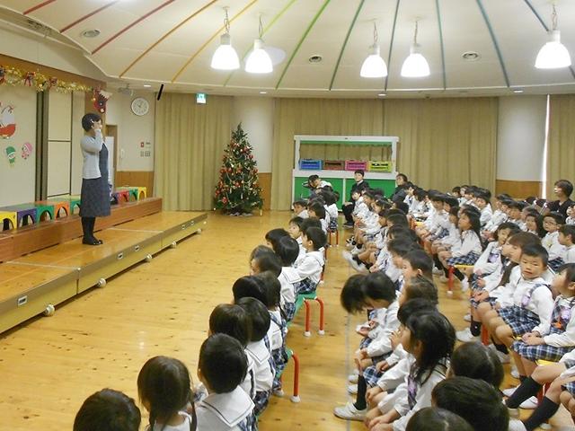「二学期には、いろいろなことがありました。たくさんのことが、出来るようになりました。先生のお話も良く聞けるようになりました。歌やダンス・マーチングやフラッグ体操・お絵かき・制作・お片付けやお掃除、そして、なによりお友達に優しく出来るようになりました。いっぱいできるようになって、賢くお利口になりました。ということで終業式をするのですよ。」と言うと子どもたちの目がきらきら輝いてお話もしっかり聞けました。