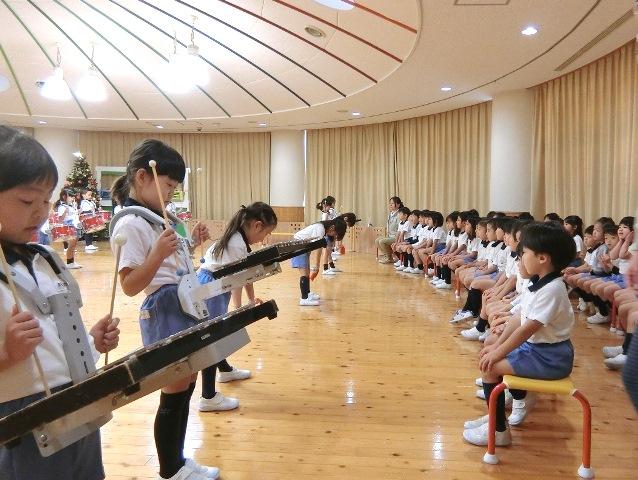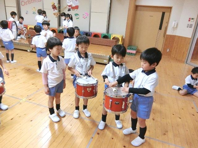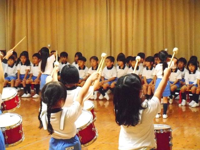 年長組から、年中組へ「来年のマーチングは、まかせたよ」と言って各パートごとに鳴らし方を教えました。また、年中組から、年少組へ「来年のフラッグは、まかせたよ」と言って、各パートごとに振り方を教えました。