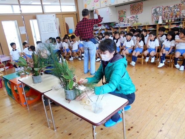 秋から冬に自然が移り変わる様子から、「いよいよ冬になり、もうすぐお正月が来ますね」とおっしゃって森から持ってきて下さった、松・竹・梅・南天などを使って門松を作って下さいました。それぞれの由来を教えて下さったので、四季の移り変わりを大切にする日本の伝統がよくわかりました。
