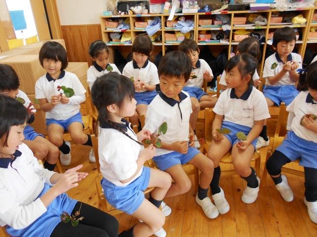 森から、たくさんの木の葉や木の実のお土産を持ってきていただきました。今年は、長い間暖かかったので、紅葉した木の葉が、散らずにまだ、きれいな赤や黄、茶、薄黄緑に色づいているものを見せて下さいました。