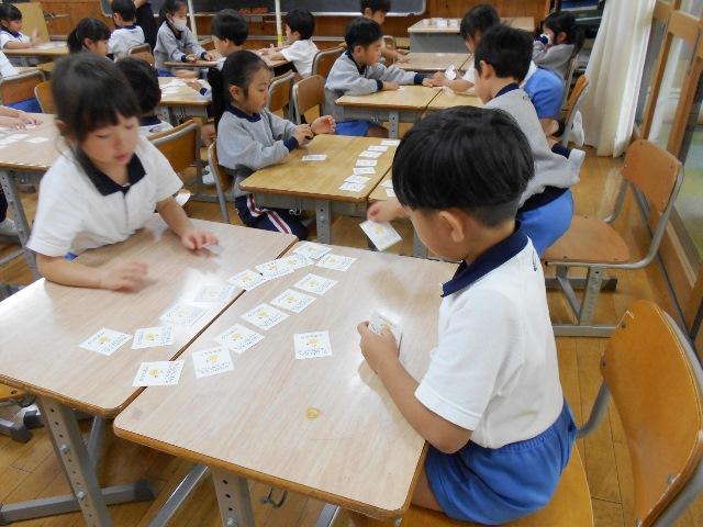 数カルタのルールは、神経衰弱のように、二枚のカルタをめくって、10この●が、きっちり揃うと正解というもので、なかなか揃えられない子どもたちとすぐに揃えられる子どもたちがいました。数字と個数の概念が楽しみながら身につくものでしたが、カルタの数が18枚あるのを数えたり、自分のカードの数を数えたりとあちこちで、算数の体験学習が出来ました。