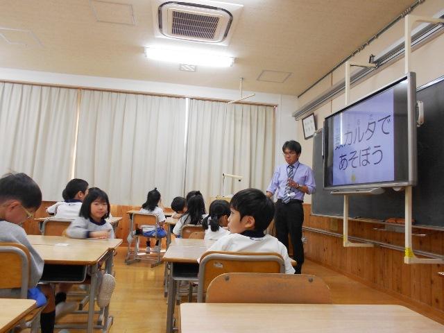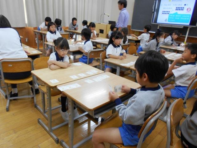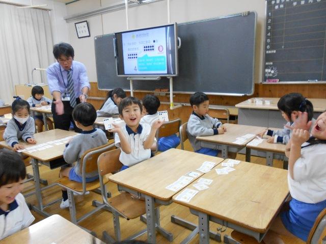 算数の授業は、教頭先生でした。算数の講座では、数カルタをしました。教頭先生が、パワーポイントを使ってルールがよくわかるように説明して下さいました。子どもたちは、しっかり画面を見ながら、説明を聞いていました。
