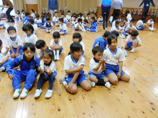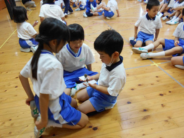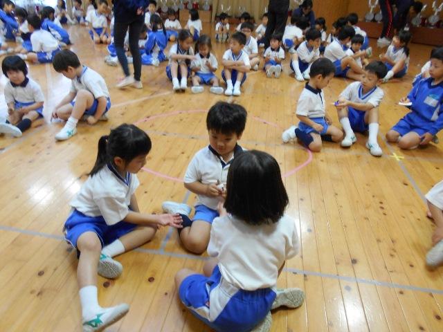 PP1P1の交流会で、こんかいは、小学校の1年生のお兄ちゃん、お姉ちゃんが、幼稚園の遊戯室に来てくれました。